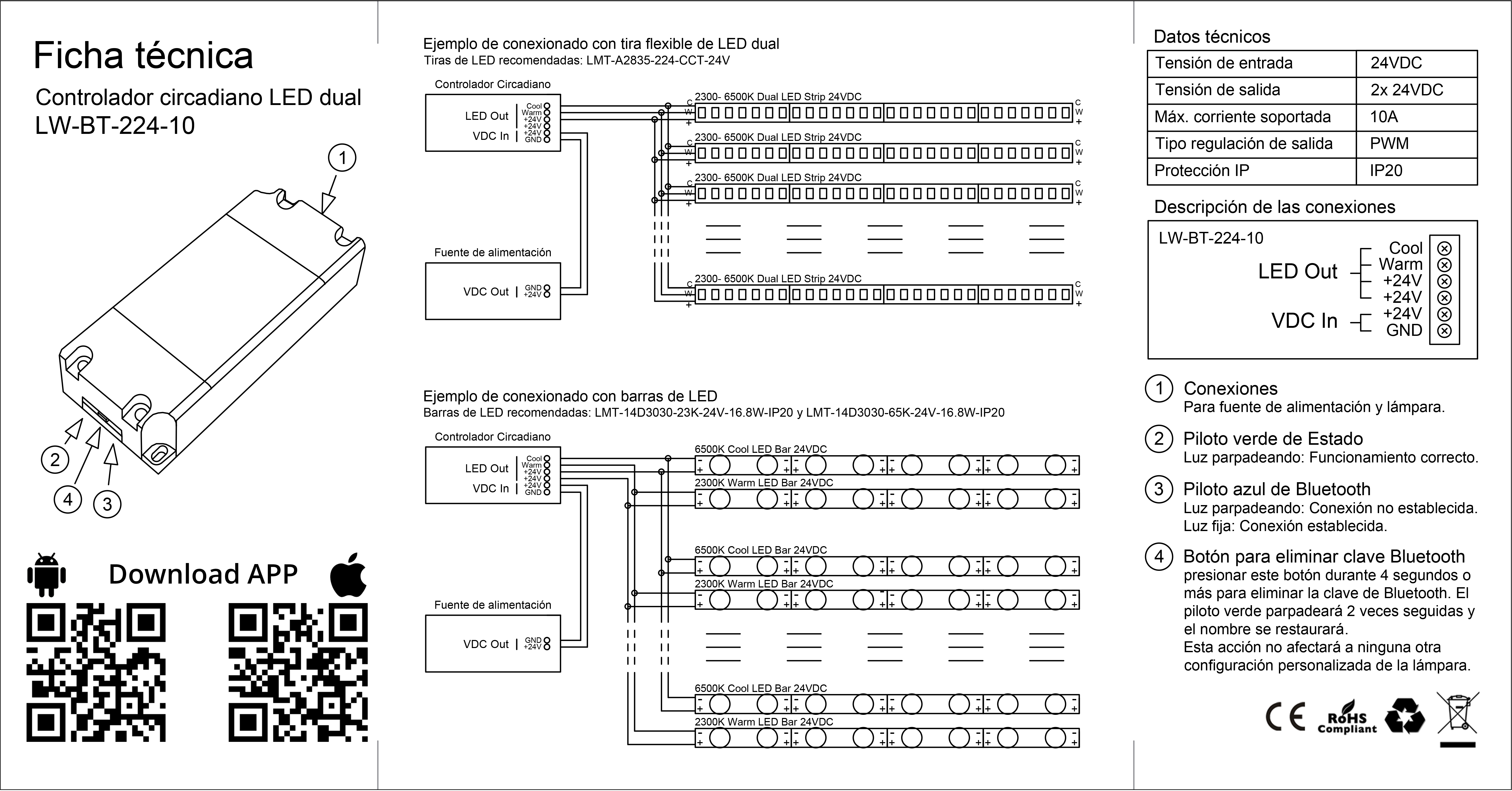 El controlador de luz circadiano emula con precisión la temperatura de color y la intensidad de la luz natural, adaptándose al lugar y momento exactos de la instalación. Tras una configuración inicial mediante su app, que sincroniza la posición GPS y la hora GMT, el controlador utiliza su algoritmo y curvas programadas para localizar la posición del sol en tiempo real y ajustar los valores de luz en consecuencia.